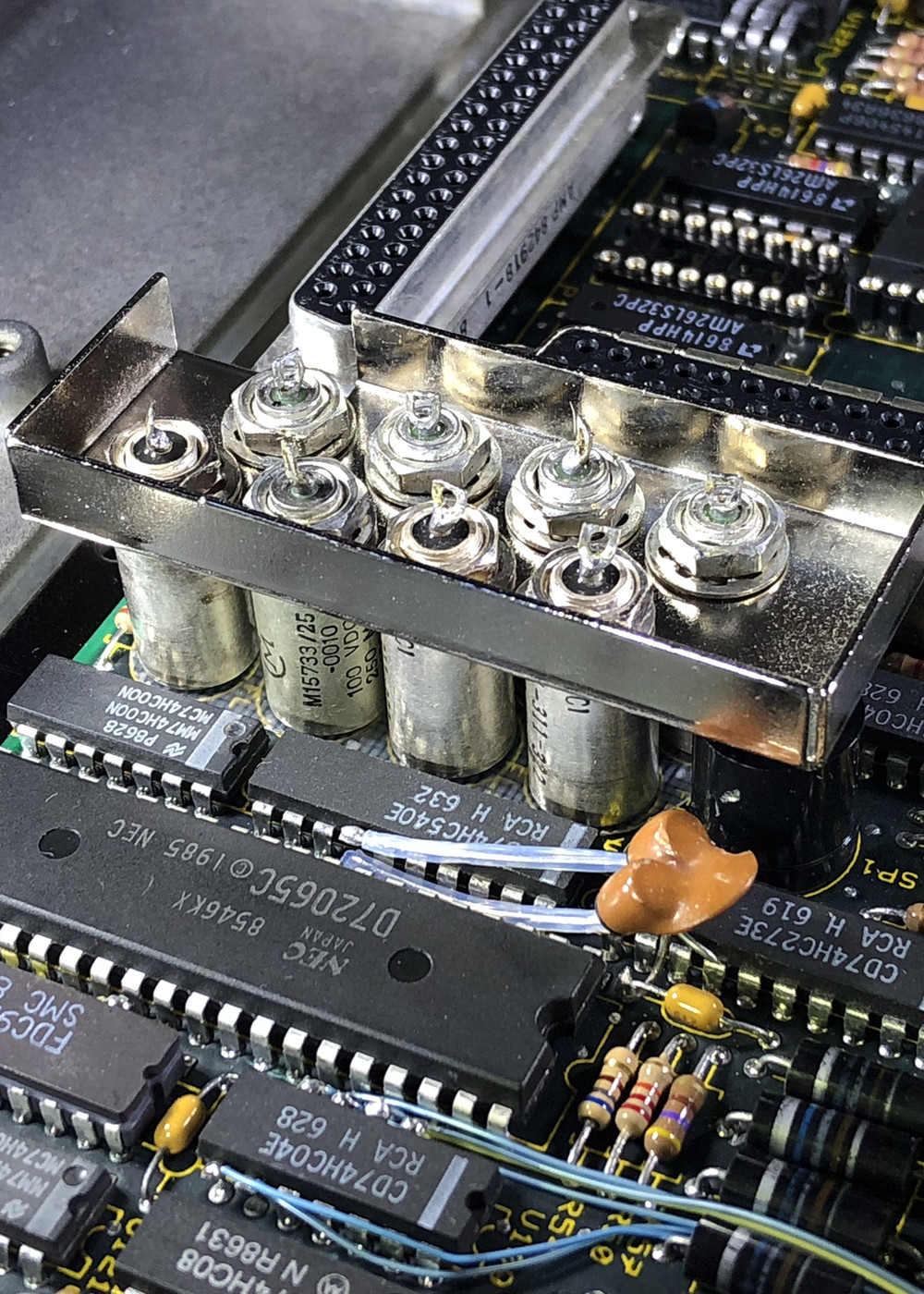 All the filters are soldered to the motherboard and threaded through a top plate which, in addition to connecting all the filters' cases, has a lip running across its edges where fingerstock is clipped. The whole thing is secured with each filter getting a lockwasher and hex nut.